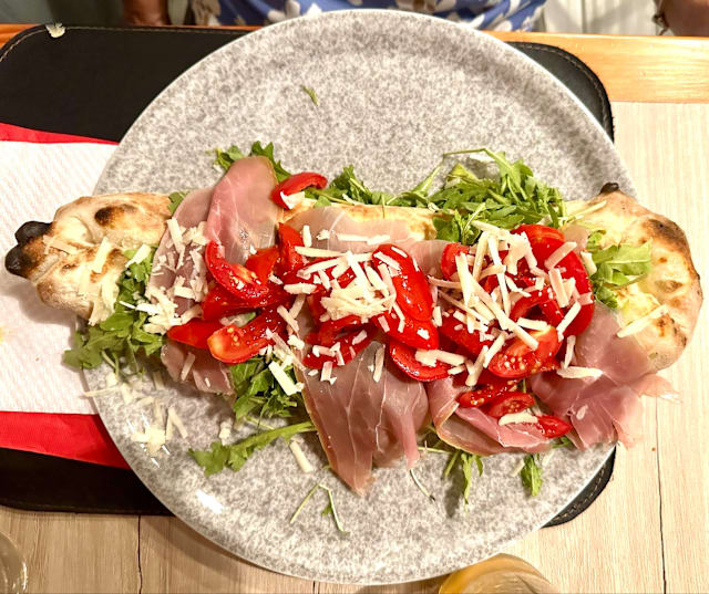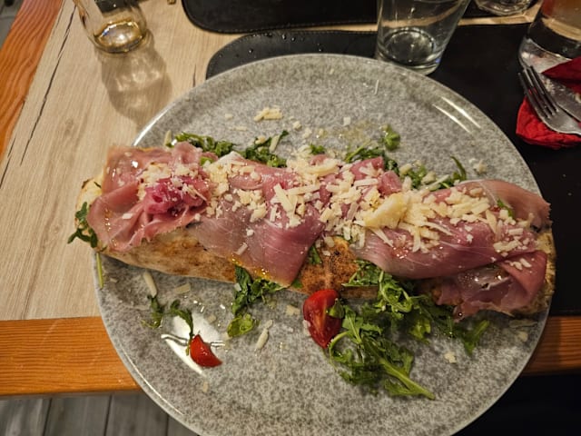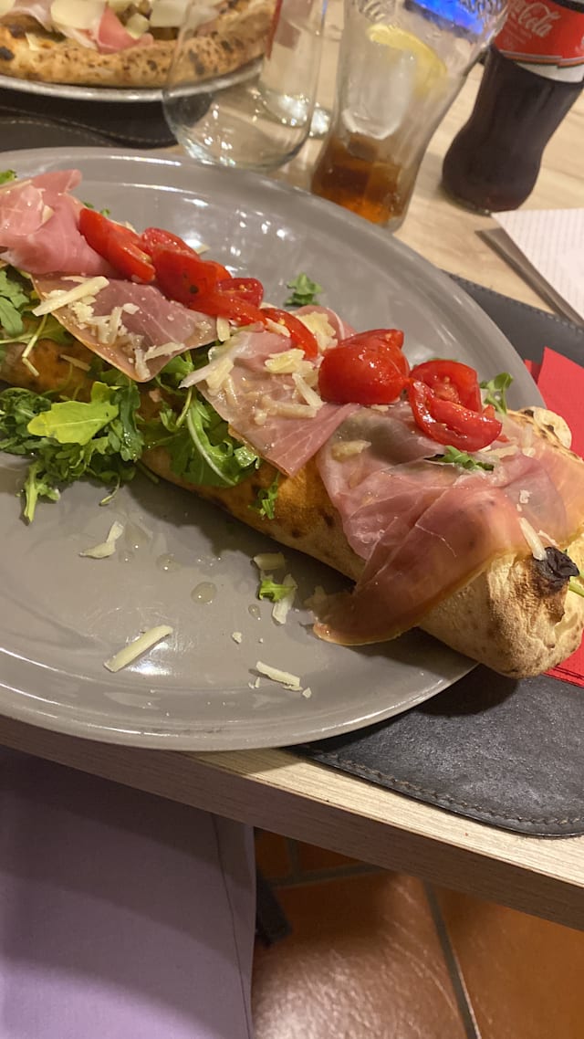 Sfilatino di pizza imbottito con provola di agerola e emmenthal, in uscita prosciutto crudo di parma, rucola, pomodorini, scaglie di grana, olio evo