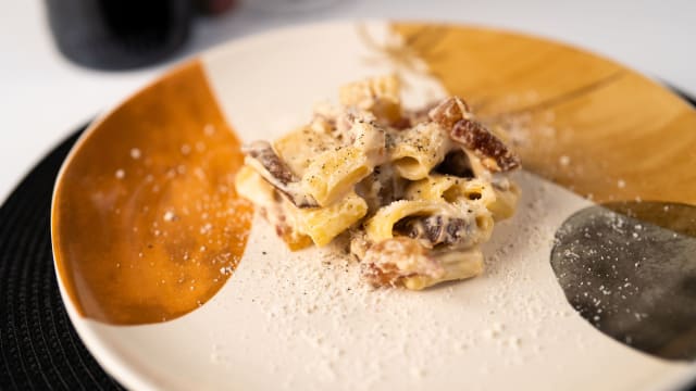 Mezzo pacchero acqua e farina con pomodoro, pecorino romano e guanciale