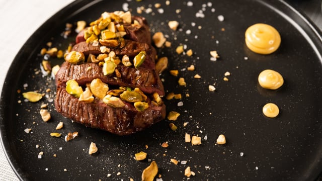 200gr di controfiletto, accompagnato con pistacchi e anacardi, servita con salsa sinestèsi.