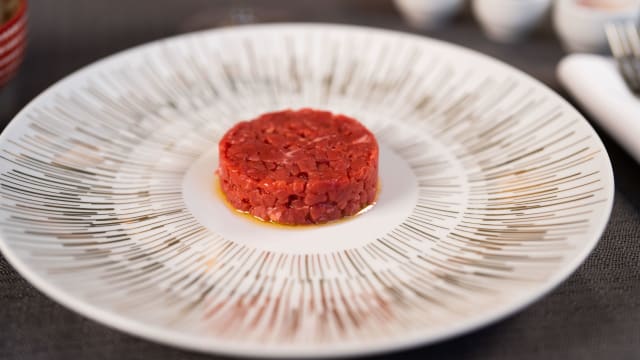 200gr di carne di manzo, cruda, tagliata al coltello, accompagnata da salsa sinestèsi e hummus di ceci