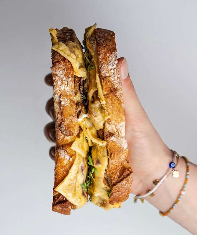- Omelette with buffalo mozzarella, tomato, homemade pesto & fresh basil served on sourdough toast