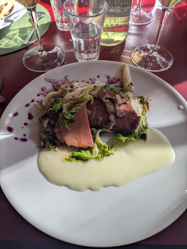 - Cono salato ripieno di ricotta di mandorle su spinaci saltati e crema di carote alla senape
