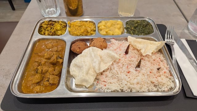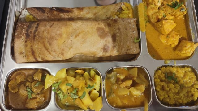 Une crêpe fine et croustillante à base de riz et de lentilles fermentées, farcie d'un mélange épicé de pommes de terre, d'oignons et d'épices aromatiques. Servie avec du paruppu (lentilles), sambar, kathirikai (aubergines mijotées), sambal et un curry au choix (poulet, boeuf ou soja).