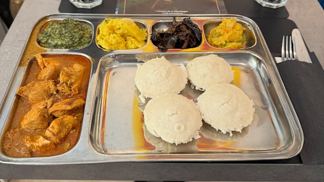4 moelleux gâteaux de riz vapeur servis avec sambal épicé, paruppu (lentilles), sambar, kathirikai (aubergines mijotées) et un curry au choix (poulet ou soja).