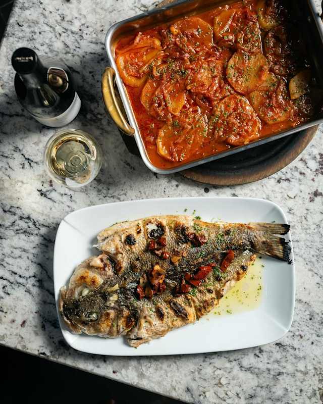 - Pescado del día a la brasa, fondo de patata, cebolla y tomate al horno - s/m