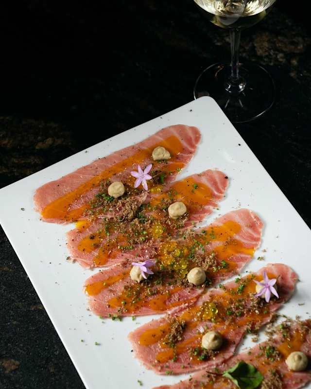 - Carpaccio de ventresca de atún rojo “balfegó”, yema de huevo, berenjena y trufa de verano