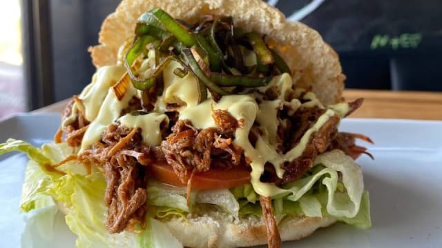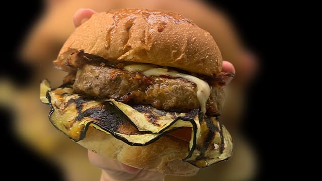 Hamburger di salsiccia con cipolle caramellate, pomodoro, insalata, crema di peperoni arrostiti e senape leggera