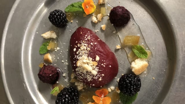 Pear & hazelnut cake served with preserved pears & hazelnut ice cream