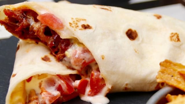 Pane nero, zucchine, melanzane, peperoni grigliati, pomodorini secchi sott’olio, brie, salsa bourbon. è possibile aggiungere ingredienti extra consultandone i prezzi.