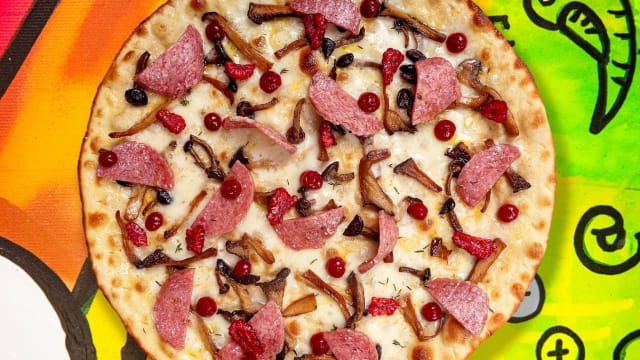Funghi arrosto, fior di latte, prosciutto cotto alla brace, olive taggiasche, sale kala namak