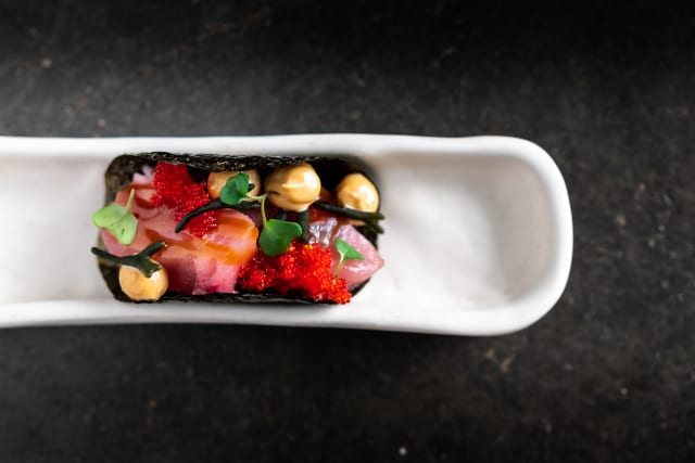 Alga nori caramelizada con tartar de lubina