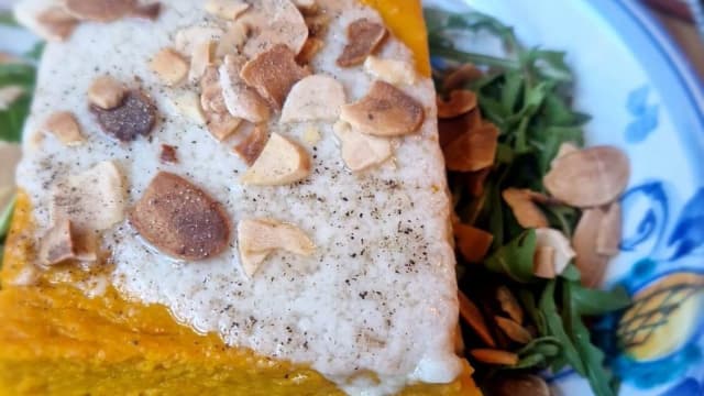 Battered and fried cod fillet, served on sautéed escarole, sultanas and pine nuts, with home-made black garlic mayonnaise