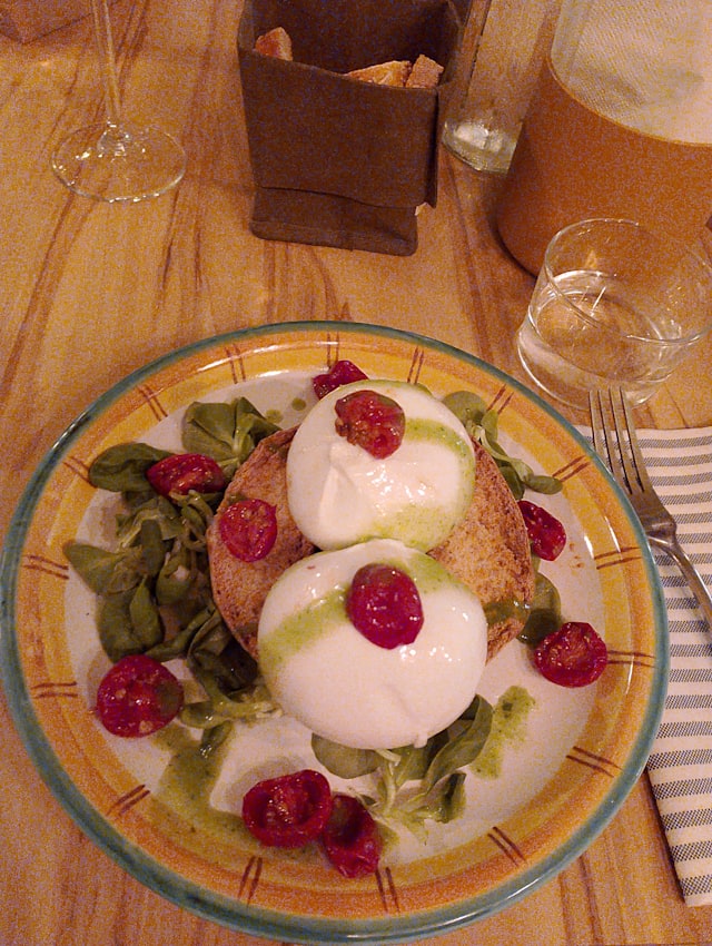 Apulian frisella (toasted bread) served with burrata cheese, confit cherry tomatoes and basil-flavoured oil