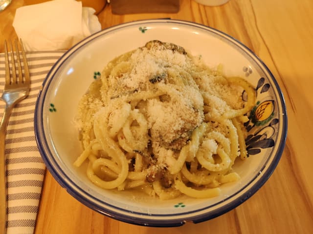 Home-made squared spaghetti with fried courgettes and Provolone del Monaco DOP cream