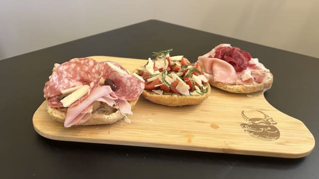 1. crema di gornzola, porchetta d’aricca e cipolla caramellata 2. melanzane sott’olio,carciofini sott’olio, pomodori secchi,tuma, salame di cervo e prosciutto cotto alla brace 3. pomodori piccadilly,buratta,verdure grigliate marinate,scaglie di pecorino
