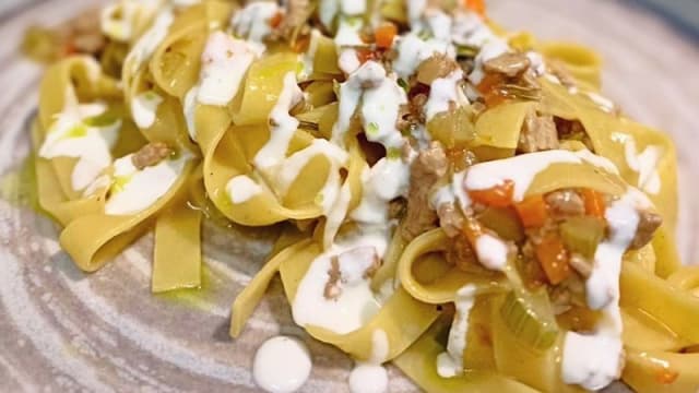 Tagliatella con ragù bianco di cinghiale affumicato a freddo , crema di parmigiano e olio al prezzemolo