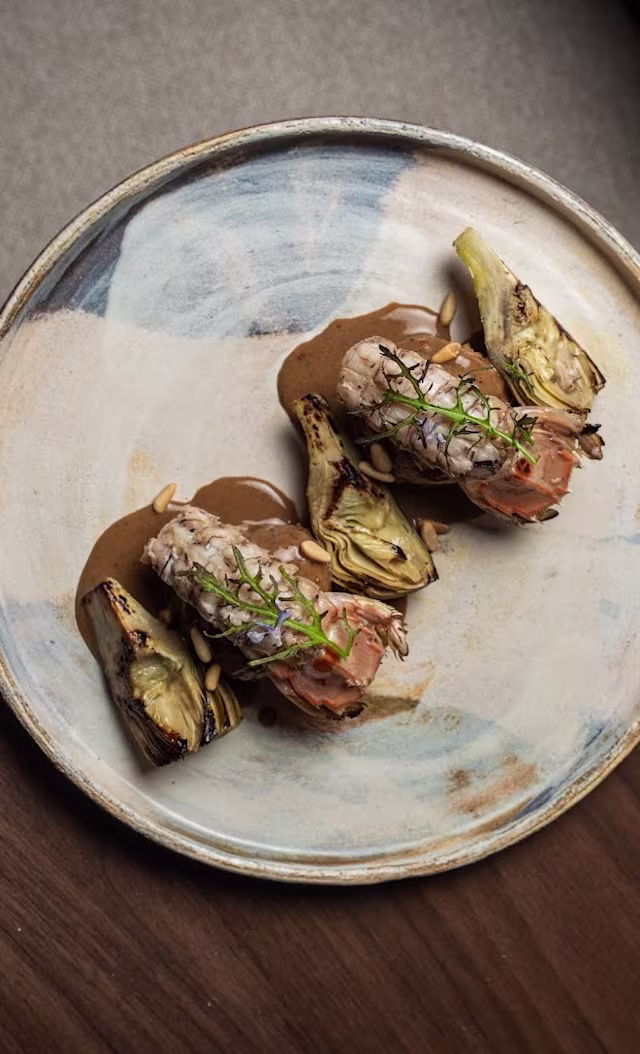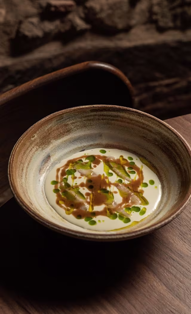 - Reducción de gamba roja de palamós, crema de almendras y aceite de eneldo