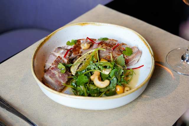 - Panceta a baja temperatura, vinagreta umami y ensalada de rúcula