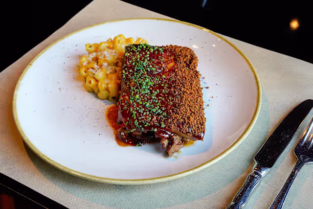- Costilla de cerdo duroc lacada con salsa barbacoa y pasta tiburón con crema de cheddar