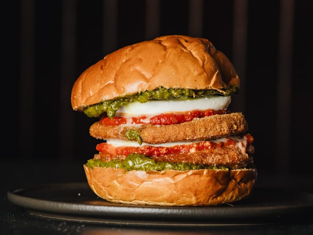 Melanzana panata e fritta, mozzarella di bufala, parmigiano, salsa al pomodoro, pesto di basilico