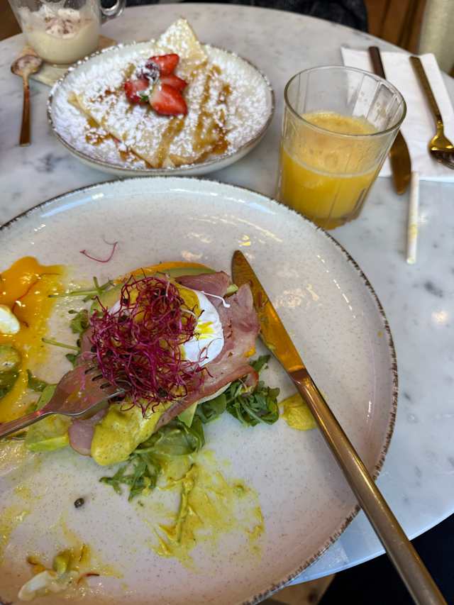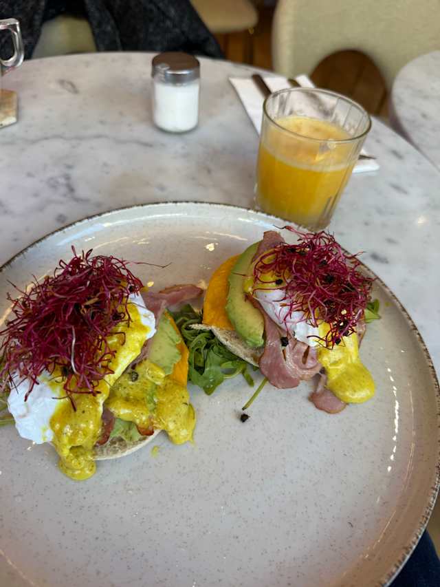 - Pain fermier, cream cheese, saumon, avocat et oeuf poché, oignons frits, crème de balsamique