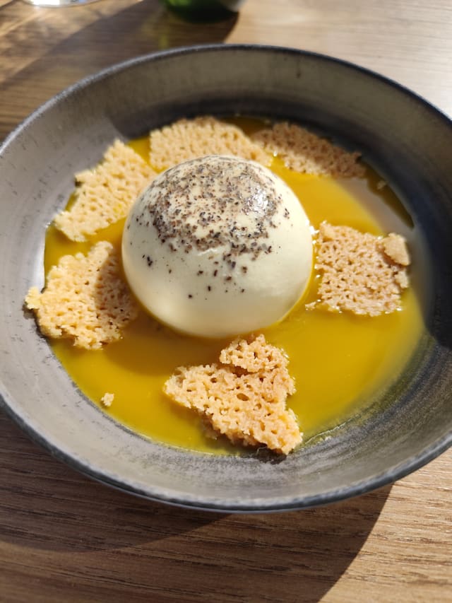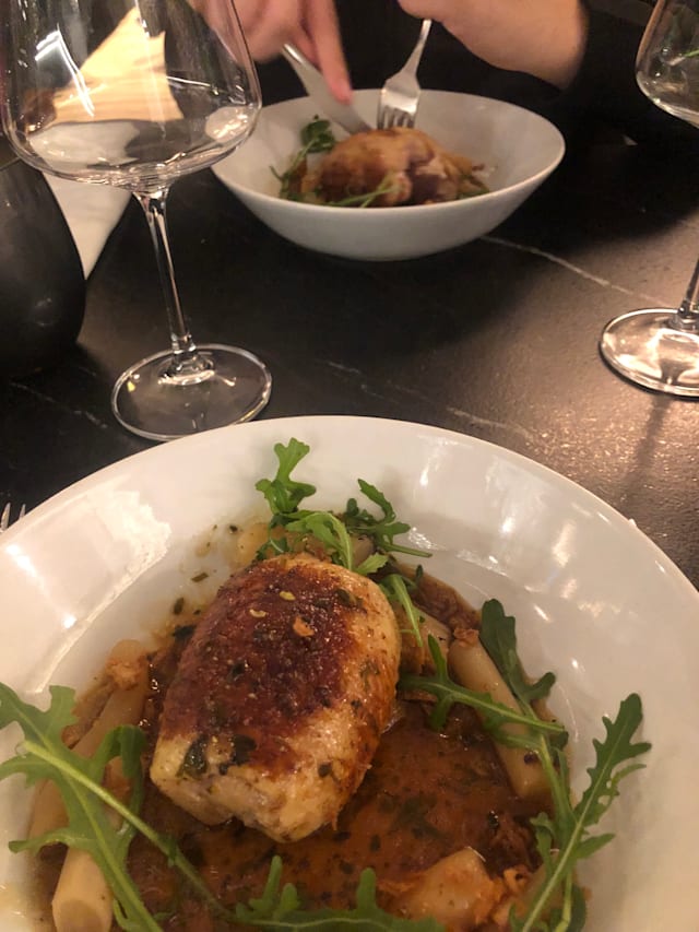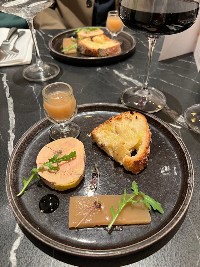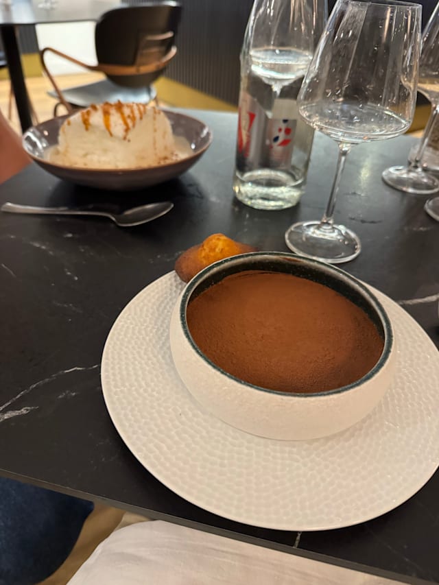 7/10Food was ok. Correctly done but without inspiration. The fried onions on the gnocchi didn’t fit at all. The chocolate mousse was made from excellent chocolate but quite dense while the menu claimed it would be fluffy. Had an excellent red wine from the Rhône valley: l Les Roches Alpines Gigondas 2020