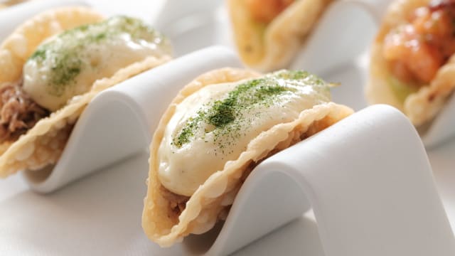 Tacos croccante, spalla di maiale, spuma di patate e togarashi