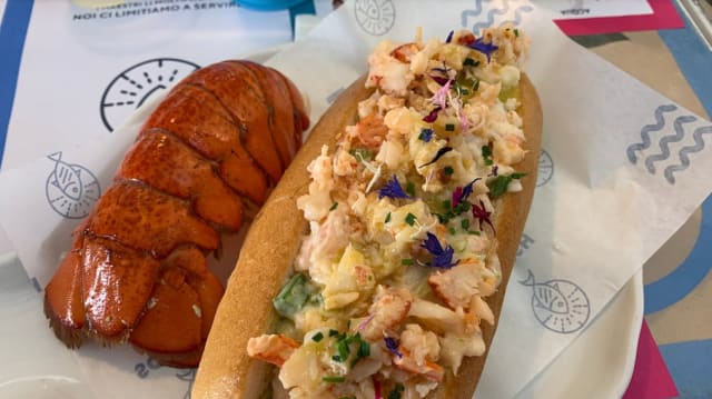 Burger ai 5 cereali, gamberone scottato, speck tirolese croccante, stracciatella profumata al lime, misticanza, citronette al limone.
