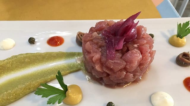 Tartare di tonno fresco, insalata, guacamole, burrata fresca.