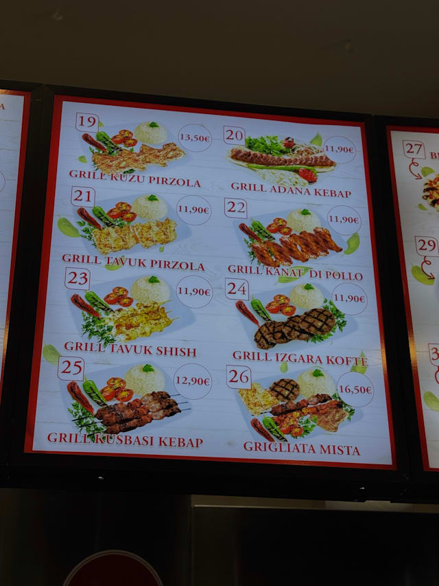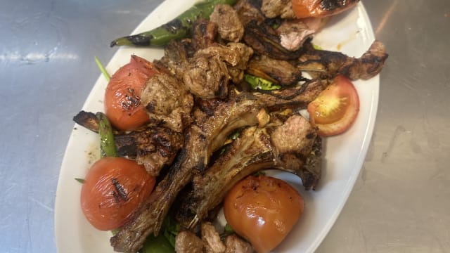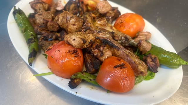 Pezzi di : kuzu pirzola(carne di agnello), kusbasi(carne di agnello), kofte(carne di manzoagnello), tavuk shish(pollo) e tavuk pirzola(pollo). Accompagnato con riso e patate fritte* , insalata mista, crauti,cipolla,pomodoro e pepperone piccante grigliato.