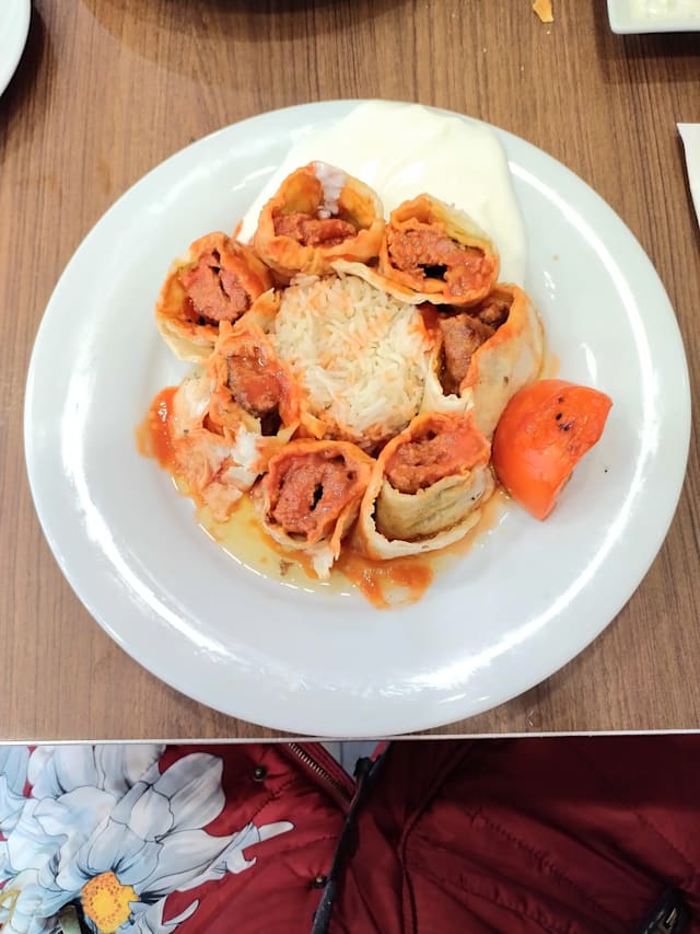Invelto di spiedi̇na adana(carne di manzo agnello):con burro,salsa di pomodoro,sale, accompagnato con riso, yogurt, pomodoro e peperoni piccante grigliato.