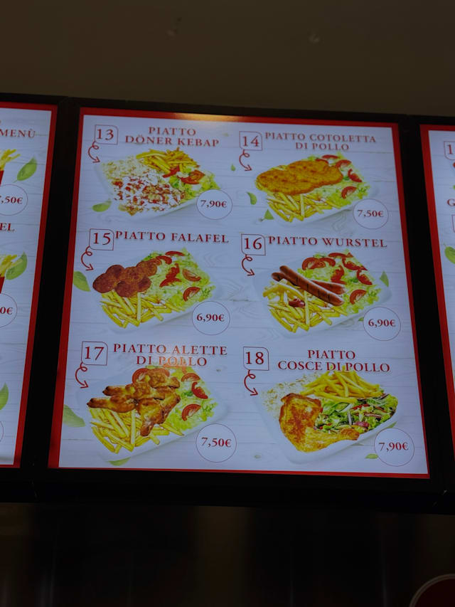Carne di manzo-agnello(kofte), con sale, paprika. Accompagnato con riso e patate fritte* ,insalata mista, crauti,cipolla, pomodoro e peperoni piccante grigliato.