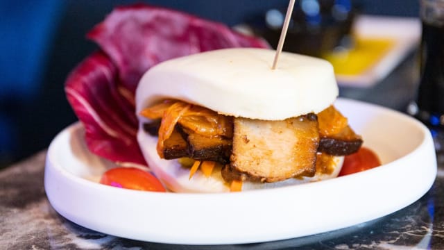 Pane al vapore con ripieno di maialino biologico , insalata e salsa pechinese