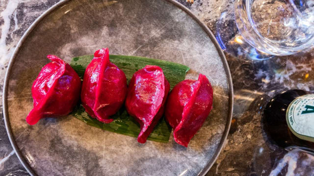 Raviolo al vapore con ripieno di manzo e salsa al tartufo nero