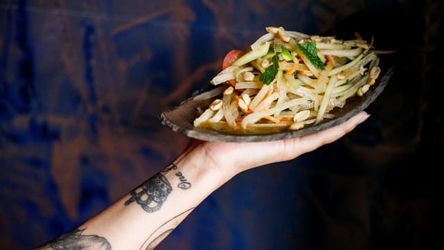 Papaia verde, fruta exótica, molho tamarindo e lima