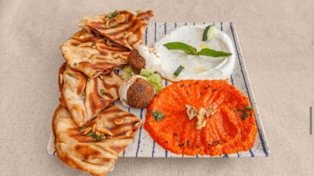Falafel, hummus, labneh, mohamara, mousakaa y warak inab