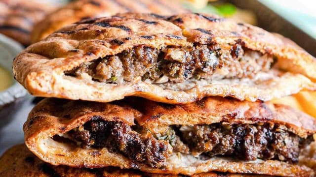 Tiras marinadas de ternera y cordero al estilo libanés, servidas en pan
