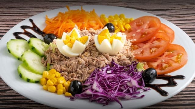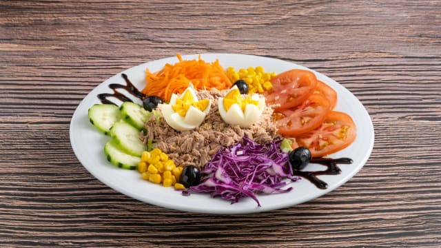Alface, atum, ovo cozido, cebola roxa, tomate e azeitonas
