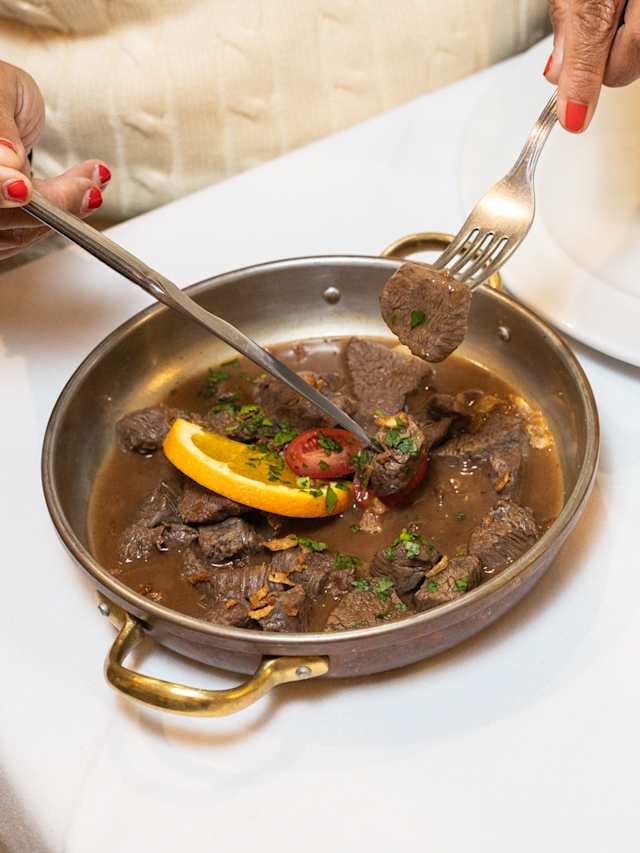 - Entrecôte de novilho fatiado na tábua com risoto de cogumelos