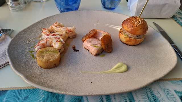 - Tartare di tonno al coltello con pomodorino fresco, olive taggiasche, olio alla salicornia, cialda croccante, piccolo accompagnamento di giardiniera e cipolline caramellate