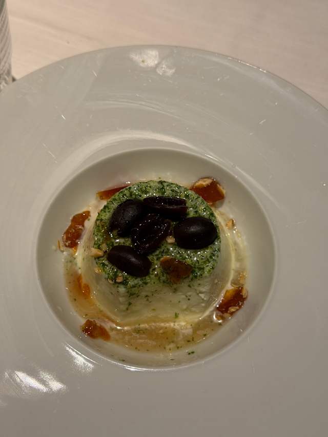 - Panna cotta in infusione di basilico fresco di pra, croccante di pinoli, olive taggiasche caramellate.