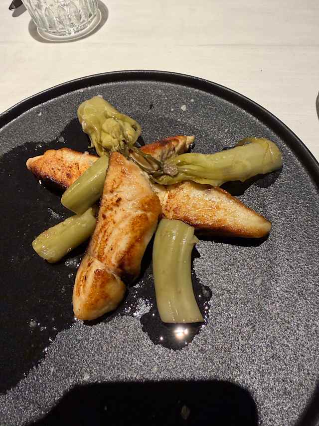 - Il pescato del giorno con la sua carne pregiata è cotto lentamente a 54° ed è servito con carciofi fritti e maionese di polpo. 15 minuti