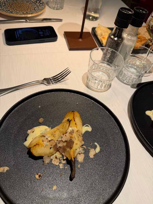 - Maialino iberico cotto lentamente a 64°, rifinito alla plancha e servito su crema di patate e porri, chips di camote *20 minuti