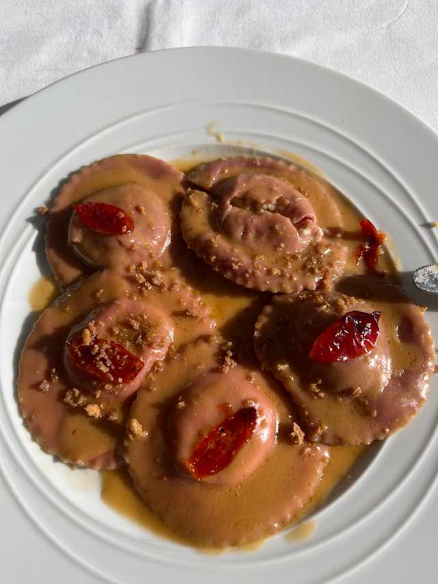 - Ravioli ripieni di pane e formaggio grana padano DOP di nostra produzione serviti con ricci di mare freschi. 15 minuti