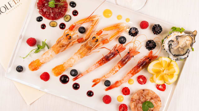 Degustazione per una persona della selezione dei nostri crudi serviti con composte e frutti di bosco: 1 ostrica, 1 gambero s. margherita ligure, 1 scampo, tartare di tonno rosso blue fin, tartare del pescato del giorno. 10 minuti