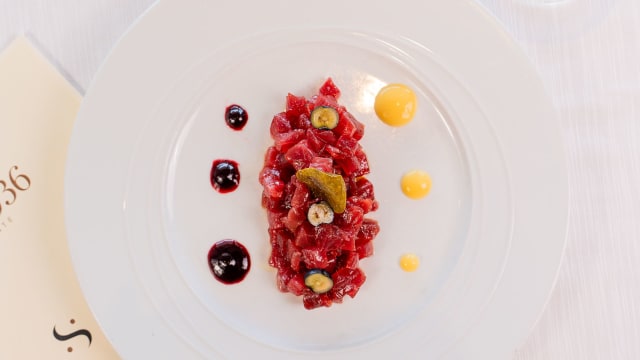 Tonno rosso prima scelta blue fin servito con composta di mirtilli e lime, rifinito con foglia di cappero. 10 minuti