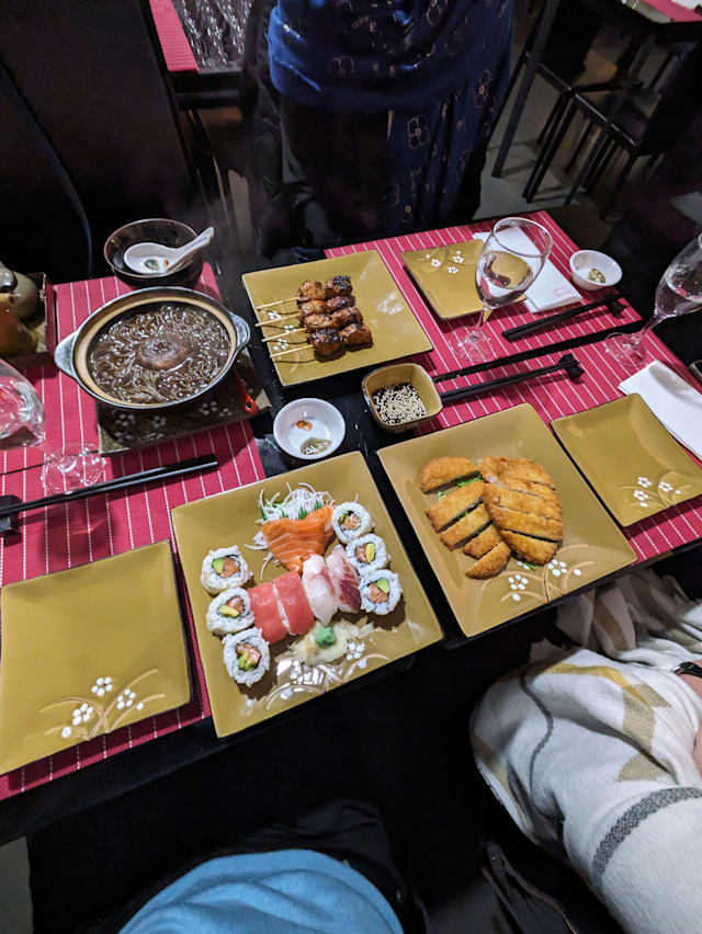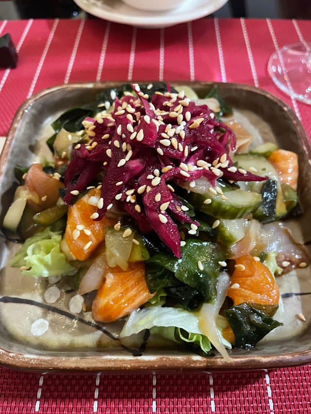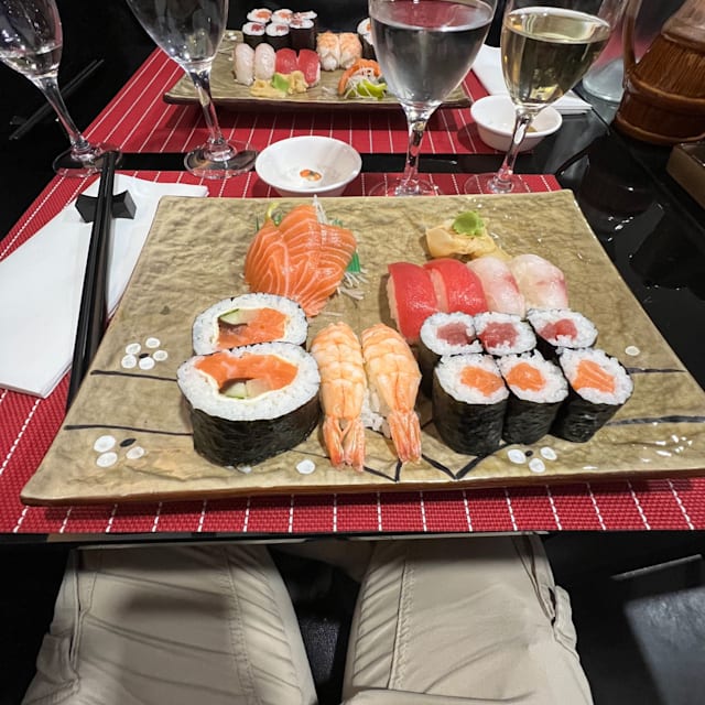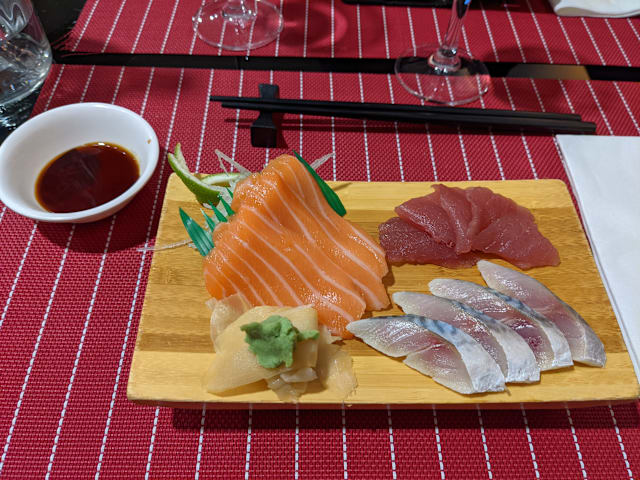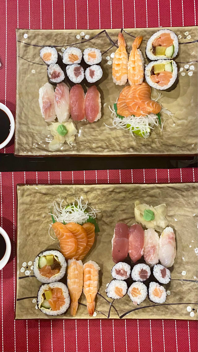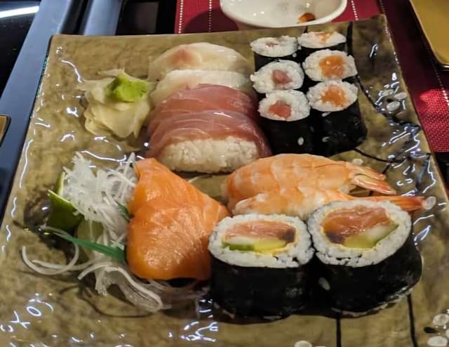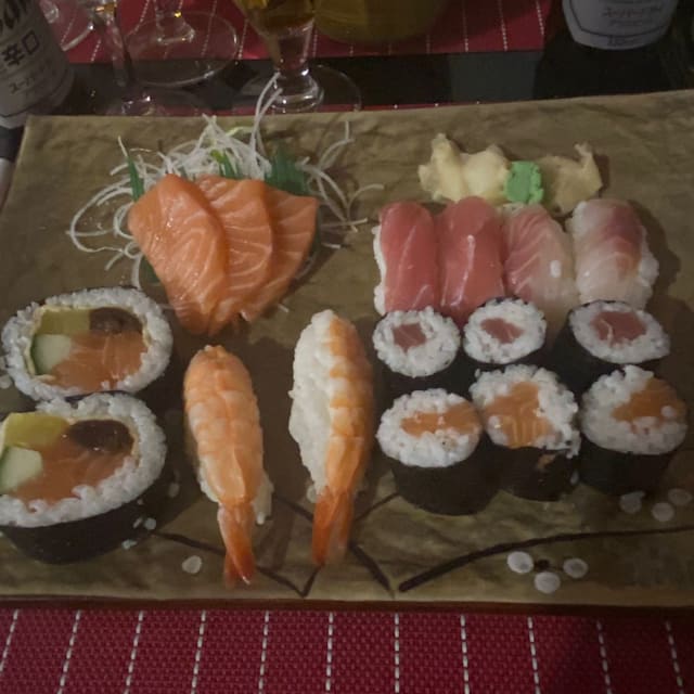 Plateau Soleil Levant (17 pièces), 3 sashimis saumon, 6 sushis thon, crevettes et daurade royale, 2 nori - maki, 3 sashe maki, 3 tekka maki et garniture€17.6Plateau Soleil Levant (17 pièces), 3 sashimis saumon, 6 sushis thon, crevettes et daurade royale, 2 nori - maki, 3 sashe maki, 3 tekka maki et garniture