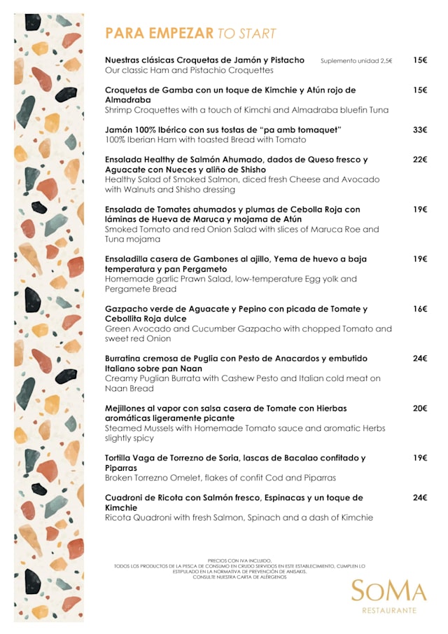 9/10This was our first time at this restaurant. It was very quiet as it was holiday on that particular day in Madrid. We ordered 2 different fish entrees, one tuna and one salmon and both were excellent. The carpaccio as an appetizer was also very good. We would certainly recommend SoMa to others.