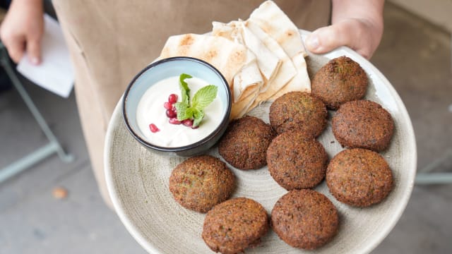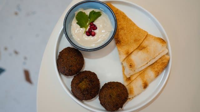 Taameyas, persil, coriandre, pickles de piments et de navets, cornichons, tomates, oignons, sumac, sauce crème de sésame