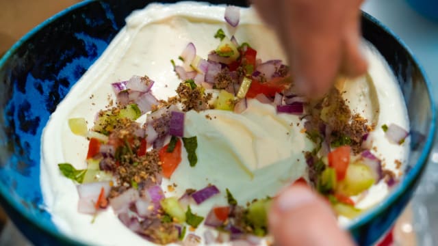 Yaourt grec égoutté la veille, pain libanais croquant au miel et zaatar